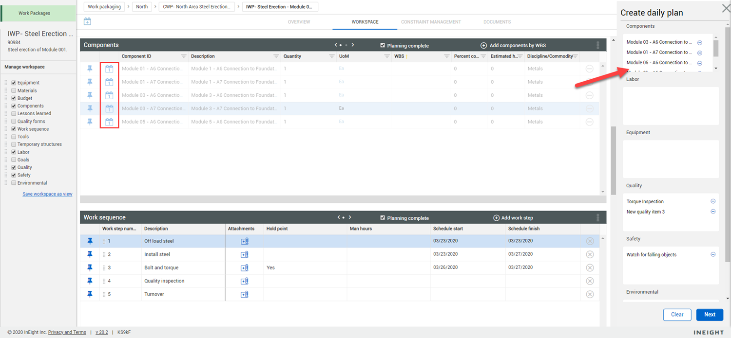 Using the scenario above as an example, your steel erection work package for your module will take multiple days to complete. You will use daily planning to plan the work in the sequence you are looking to do it in, day by day. Daily planning is a good tool to communicate to your crew your safety concerns, quality and environmental risks, and expected productivity.