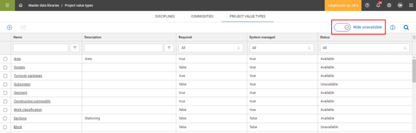 The Project value types master data page shows a list of all the values created. By default, the Hide unavailable toggle is set to On, which filters the list to show only the available project value types that can be assigned to a project. You can change the Hide unavailable toggle to Off to show all existing project value types that were created.