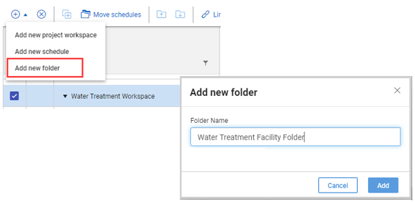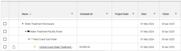 You can create and manage multiple project folders inside of a workspace to better organize your schedules. Schedule project folders act as storage containers that help you group like schedules into manageable repositories.