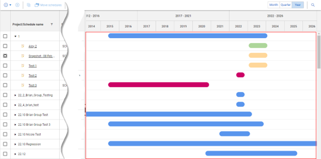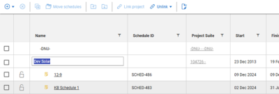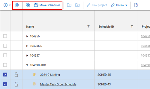 You can select multiple schedules on the Schedule home workspaces page, and then choose from the options to delete, copy or move. A locked schedule cannot be moved or deleted.