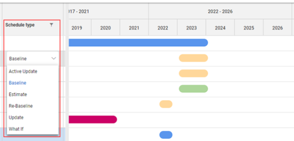 | What If | Represents variations of schedules designed to test how different scenarios impact the overall time line. Used for schedule comparison. |