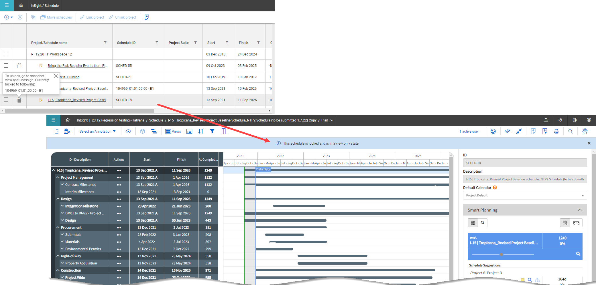 The active baseline schedule type now automatically locks the schedule and converts it into a read-only state, which includes the Gantt grid, all Iris fields, and the Import icon. The locked read only state is applied to all views and impacts any functionality that involves the changing of data.