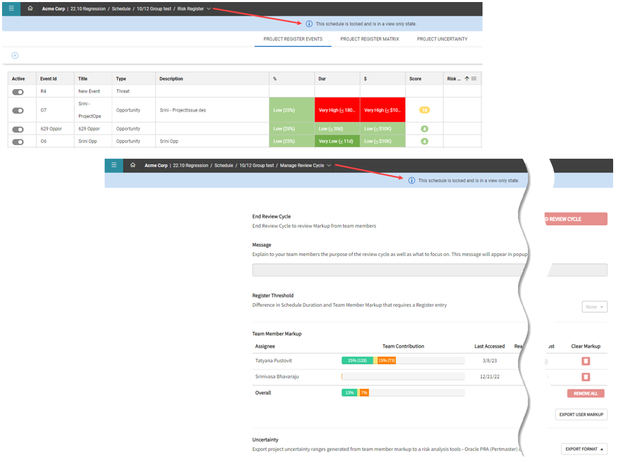 The Risk register and Manage Review Cycle views are also in a locked and view only state, but data can still be exported from the Risk register.