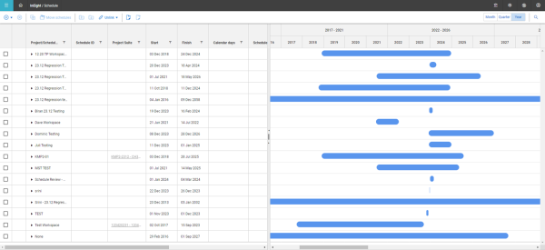 The Schedule home page is where you can see a list of projects and schedules, which includes a Gantt chart that illustrates project work and time periods. When a new project is created in InEight Platform, a workspace in Schedule is automatically added and linked to the project, which shows in the Project List view.