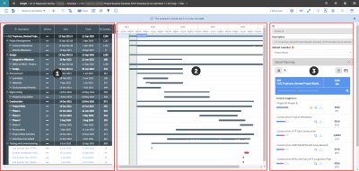 | 1 | Contains customizable Gantt chart columns providing a summary view of schedule details including, but not limited to, activity/work package description, dates, durations, float, and cost. |