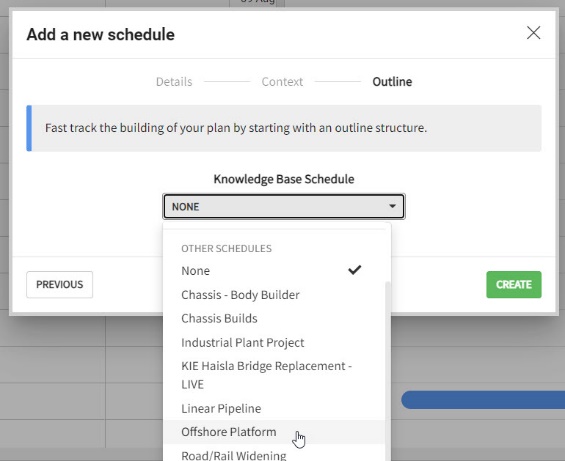 In existing schedules, at the WBS level, you can add portions of a schedule from the Knowledge Base. This is done from the Iris panel, under the Smart Planning section.
