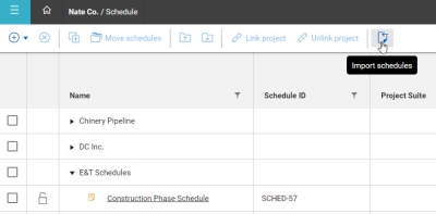 You can import and export schedule data using the Import and Export options in the right toolbar within the Plan view.