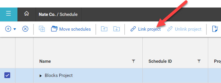 From the Project List page of InEight Schedule, you can link a schedule workspace to a project in InEight Platform by selecting Link project on the left toolbar.