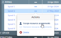 From the Plan view of InEight Schedule, you can assign resources to an activity by selecting the Actions ellipses and selecting Assign resource assignments. This opens a window where you can select from available resources or add new ones to the activity, along with productivity and cost information.