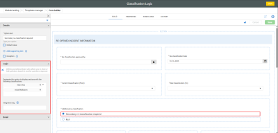 Creating logic within a template is a two-step process. First, use classifications to apply logic to a question’s response within the template. Then when that response is selected, the second classification you created on the Section header becomes visible for the user to navigate to.