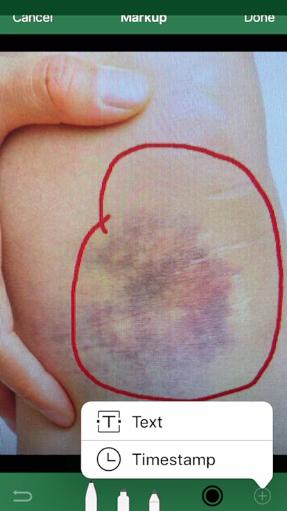 After the picture is taken, you can edit the photo by selecting the Edit button at the top right of the page. This opens editing and annotation options. There are colors, widths, and text options available. A time stamp is added when edits are made, and the stamp can be moved around the screen for optimal viewing. You can also edit the name of the image file to be more meaningful than the default name given by your device.