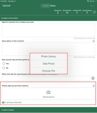 The Completions mobile application lets you attach photographs or Word, Excel, and PDF documents and annotate the areas of focus while filling out the event or task. Select Attach photos to add photos to the form or task. After tapping attach photos, it will open a page from which you can select an option from the Photo Library, Take Photo or Chose File.