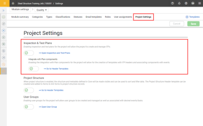 In the project’s module settings > Project Settings tab, you can enable Inspection & Test Plans for the project to create and manage ITPs. This will also enable the Open Inspection and Test Plans link to open the Inspection and Test Plans page where you oversee and manage ITPs.