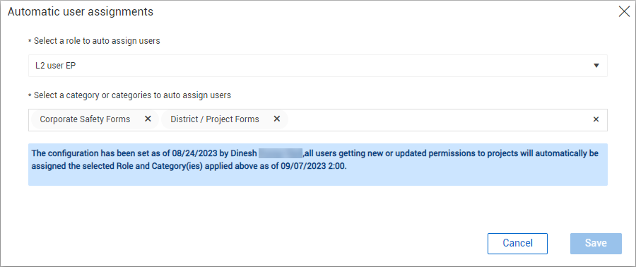The Automatic user assignments configuration lets you save administrative setup time by automatically assigning a Compliance or Completions role and categories to all InEight Platform users.