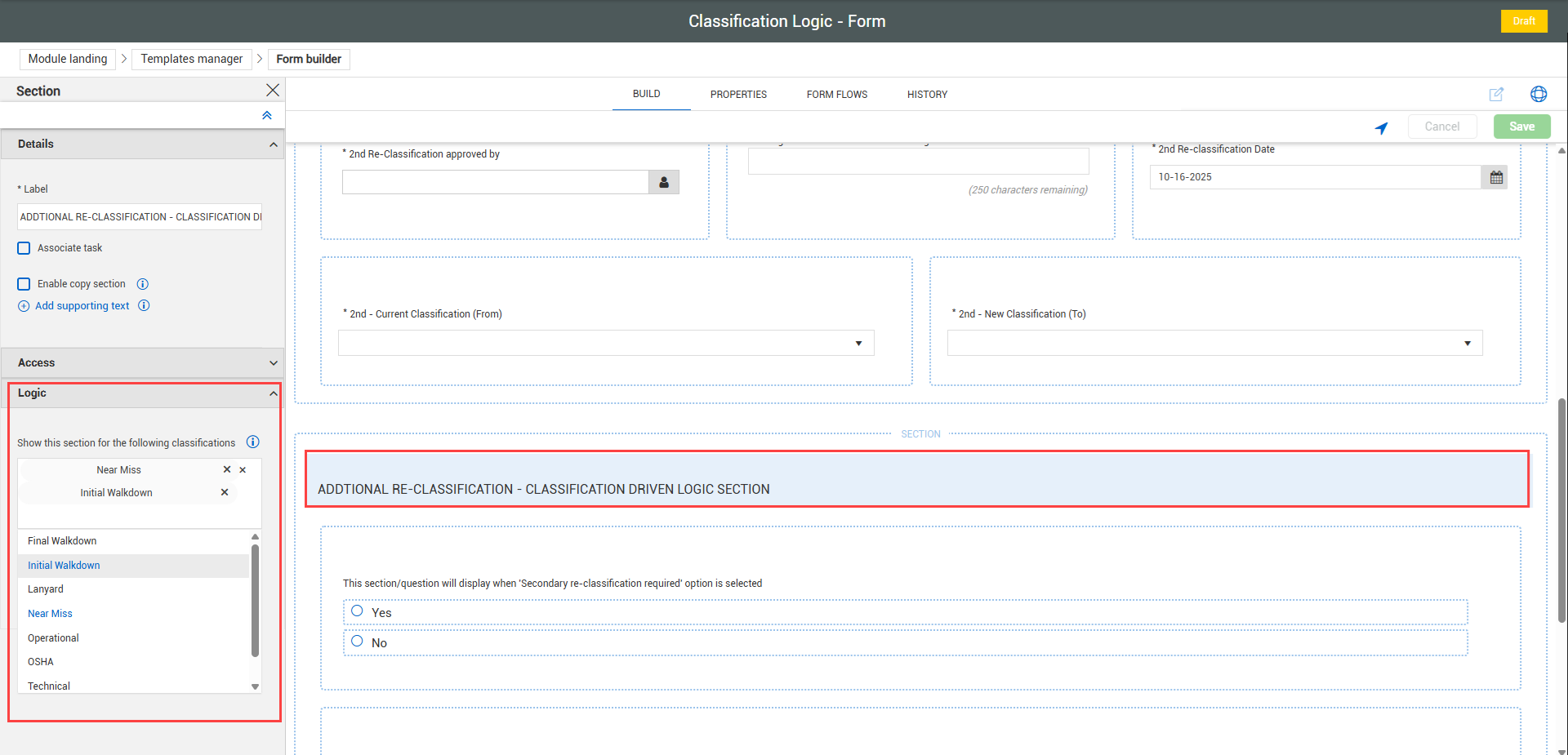 Creating logic within a template is a two-step process. First, use classifications to apply logic to a question’s response within the template. Then when that response is selected, the second classification you created on the Section header becomes visible for the user to navigate to.