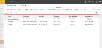 Role permissions are module specific. They are comprised of permissions that you can perform in a specific module. You can create different roles with specific permissions as needed to facilitate any process you plan to do in a module. When you create a new role, it will default to Reporter role permissions. After you create a role, you can update its permissions.