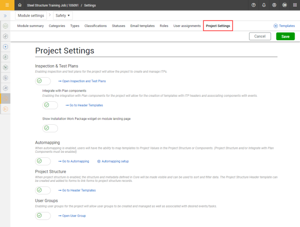 You can enable project-level settings in either the individual Compliance modules or in Completions to successfully manage projects' business processes. The settings are applied throughout the project.