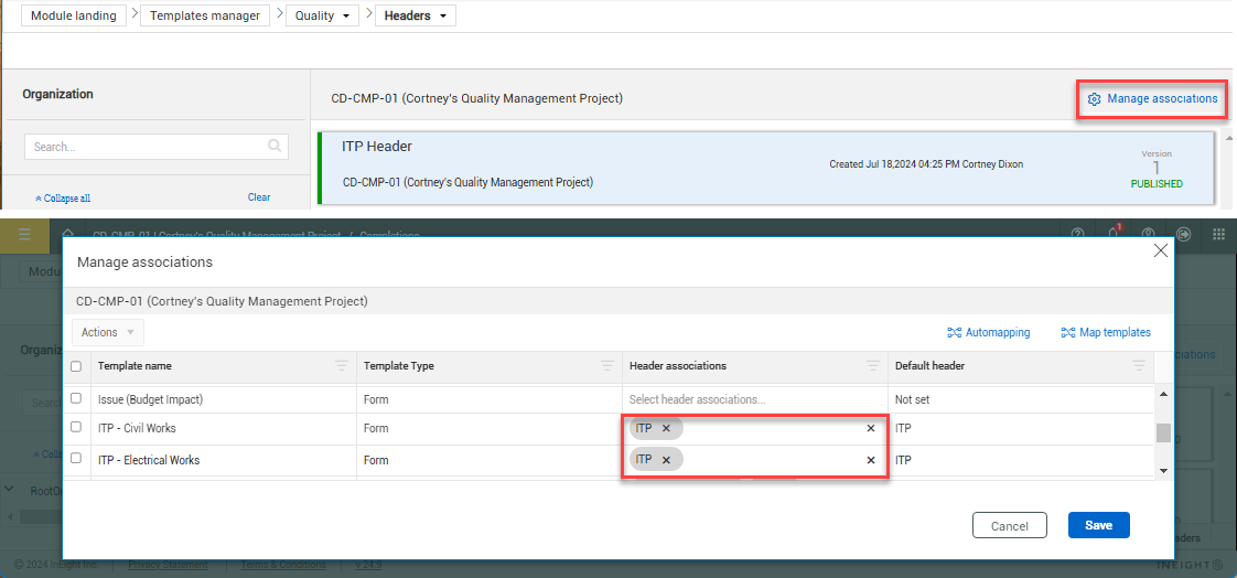 First, on the Headers page, you can make sure header associations are mapped to your ITP template. You do this by selecting Manage associations: