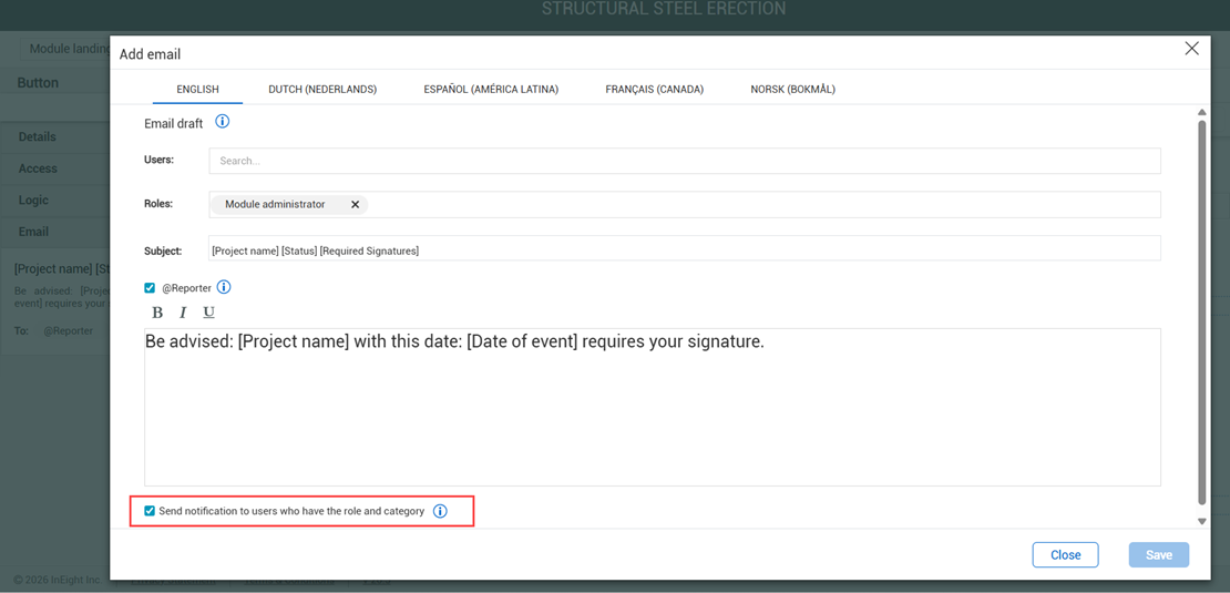 Role and category email notifications – Notifications can now be limited to users who have both the selected role and the forms category by selecting the Send notifications to users who have the role and category option in the email section of a form or task. Previously, role-based notifications ignored category access.