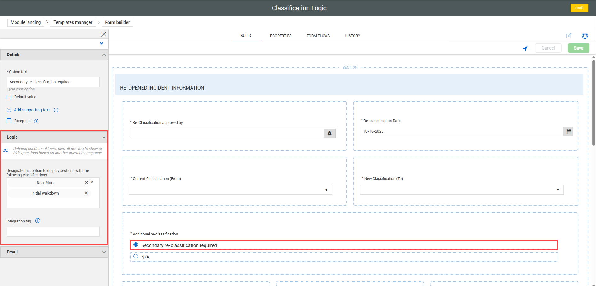 Creating logic within a template is a two-step process. First, use classifications to apply logic to a question’s response within the template. Then when that response is selected, the second classification you created on the Section header becomes visible for the user to navigate to.