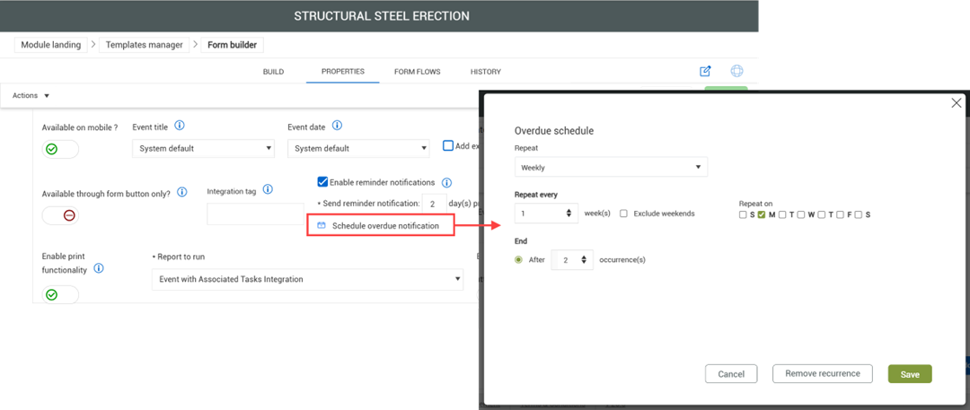 Overdue notification – You can now schedule recurring overdue notifications at the template level. Instead of a single overdue email, reminders can repeat daily or weekly, with options to exclude weekends and limit the number of occurrences.